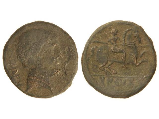 As. CONTERBIA CARBICA. Anv.: Cabeza barbada a derecha, delante delfín, detrás CARBICOM. Rev.: Jinete con lanza a derecha, debajo leyenda ibérica. 8,40 grs. Pátina oscura. AB-848. BC+/MBC-.