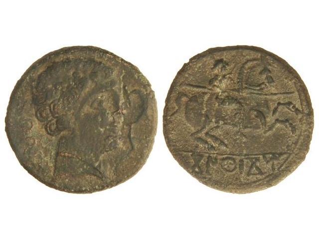 As. CONTERBIA CARBICA. Anv.: Cabeza barbada a derecha, delante delfín, detrás CARBIVOM. Rev.: Jinete con lanza a derecha, debajo leyenda ibérica. 8,60 grs. Pátina verde oscura. AB-848. MBC-/MBC+.