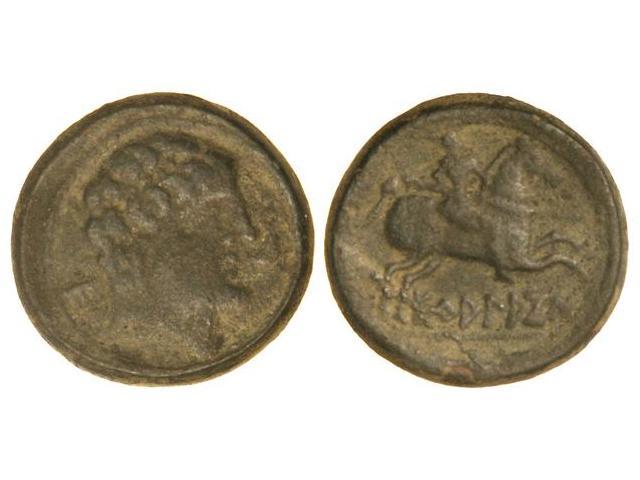 As. ECUALACOS. Anv.: Cabeza masculina a derecha, detrás E. Rev.: Jinete a derecha. ECuALACoS. 12 grs. Pátina oscura. AB-969. MBC-/MBC.