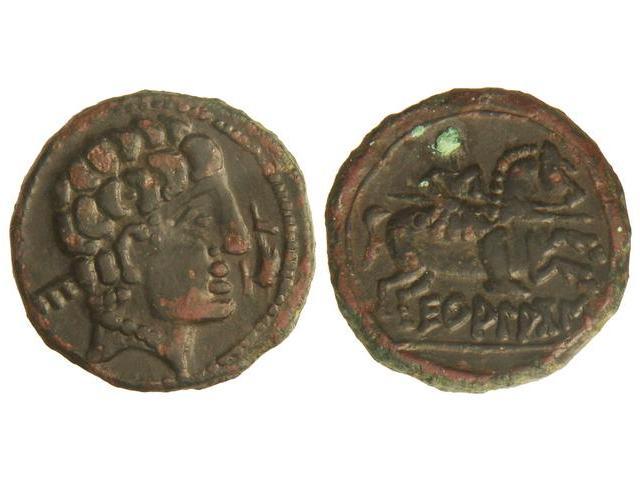 As. ECUALACOS. Anv.: Cabeza viril a derecha, detrás letra ibérica, delante delfín. Rev.: Jinete con lanza a derecha, debajo leyenda ibérica. 12,10 grs. Pátina oscura. (Pequeña oxidación en reverso). AB-754. EBC-.
