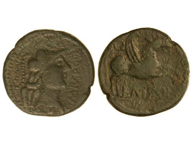 As. - EMPORITON. - Anv.: Cabeza de Palas a derecha. L. M. RVF. P. C. Q. Rev.: Pegaso a derecha. EMPORIT. 11,60 grs. Pátina verde. AB-1261. MBC-/BC+. - -