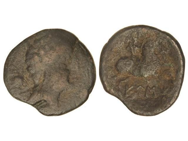As. EUSTI. Anv.: Cabeza masculina a derecha, detrás ánfora. Rev.: Jinete con palma a derecha, debajo leyenda ibérica EUSTI. 10,33 grs. AB-1299. BC+.