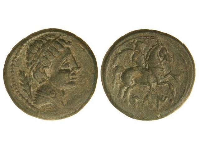 As. GILI. Anv.: Cabeza masculina a derecha, detrás espiga. Rev.: Jinete con palma a derecha, GiLI. 10,60 grs. Pátina verde. RARA. AB-1388. EBC+.