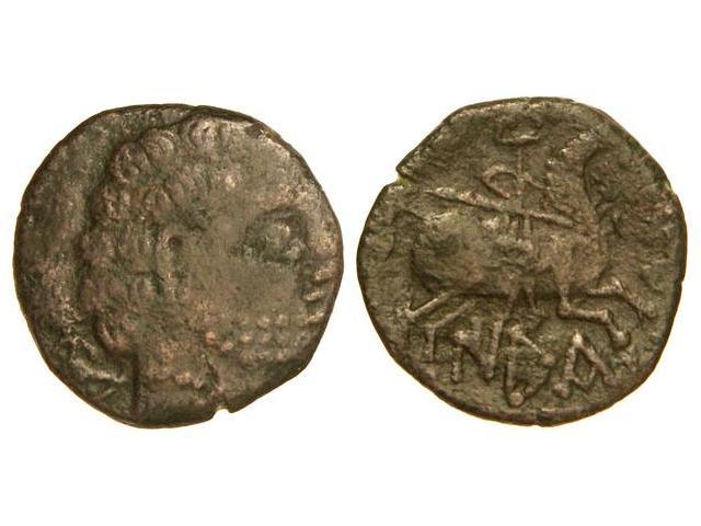 As. IACA. Anv.: Cabeza barbada a derecha, delante delfín, detrás BoN. Rev.: Jinete con lanza, IACa.