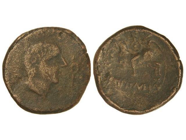 As. - IKALKUNSKEN. - Anv.: Cabeza masculina a derecha, delante caduceo, detrás (delfín). Rev.: Jinete con lanza y escudo redondo a izquierda, debajo leyenda ibérica. 17,30 grs. AB-1417; Vill-16. (MBC-)/BC+. - -