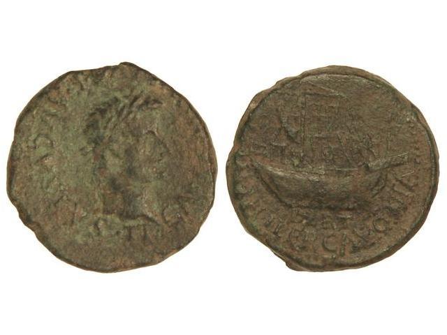 As. - ILERCAVONIA. - Anv.: TI. CAESAR DIVI. AVG.) AVGVSTVS. Cabeza laureada de Tiberio a derecha. Rev.: DERT. MH. I. ILERCAVONIA. Nave. 10,40 grs. Pátina verde. AB-1493. MBC-. - -