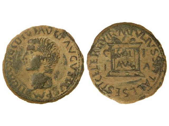 As. ILICI. Anv.: Cabeza de Tiberio a izquierda. Rev.: Ara con SAL. AVG. a los lados C.I.I.A., alrededor leyenda. 12,20 grs. CU. Pátina verde-terrosa. AB-1522. MBC+.