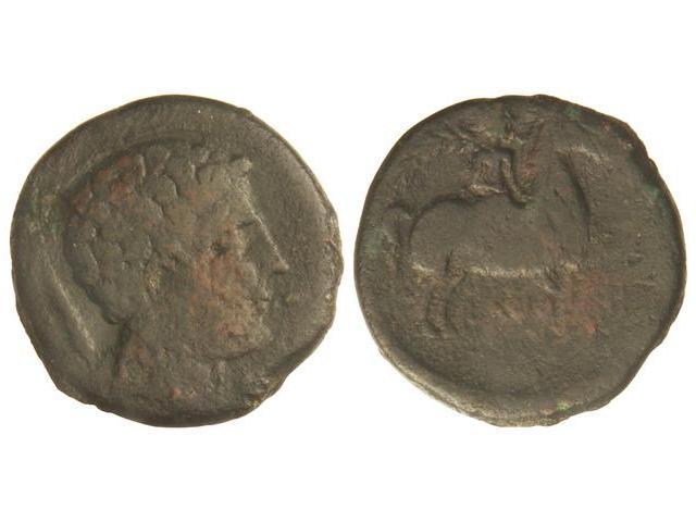 As. ILTIRCESCEN. Anv.: Cabeza masculina a derecha, detrás espiga. Rev.: Jinete a derecha con palma, debajo leyenda ibérica. 14,60 grs. Pátina oscura. AB-1446; Vill-1. BC.