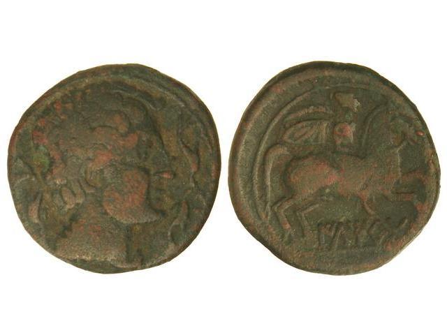 As. - ILTIRTA. - Anv.: Cabeza masculina a derecha, rodeada de tres delfines. Rev.: Jinete a derecha con palma y clámide, debajo leyenda ibérica. 11,60 grs. AE. Pátina. AB-1465. MBC. - -
