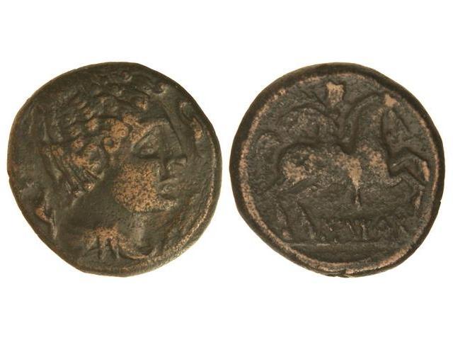 As. - ILTIRTA. - Anv.: Cabeza masculina a derecha rodeada por tres delfines. Rev.: Jinete con palma y clámide a derecha, debajo leyenda ibérica. 13 grs. (Pequeñas oxidaciones limpiadas en reverso). AB-1470 sim.; Vill-22. (MBC+). - -