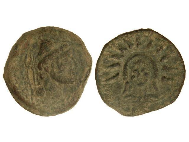 As. MALACA. Anv.: Busto de Vulcano barbado a derecha con birrete cónico terminado en borla y coleta a derecha, detrás tenazas y (leyenda). Rev.: Busto de Helios de frente radiado. 9,80 grs. Pátina verde. Cuño de buen arte y detalle en el ves