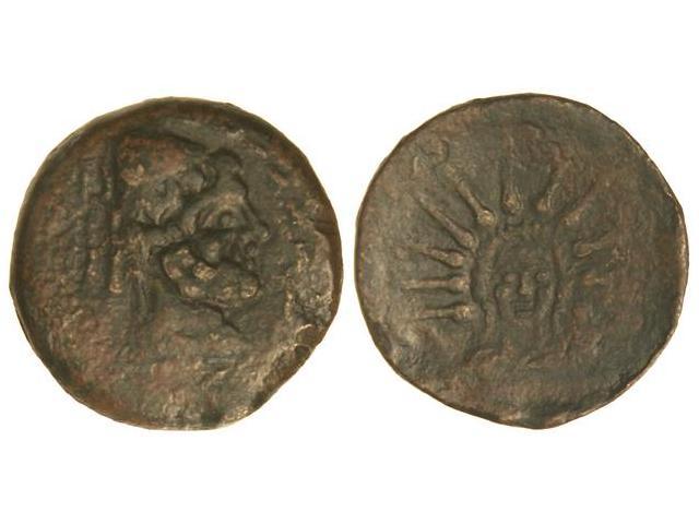As. MALACA. Anv.: Busto de Vulcano con birrete cónico y coleta a derecha, detrás tenazas y (leyenda). Rev.: Busto de Helios de frente rodeado de rayos. 12,50 grs. Variante de G.G.-1. Imitación tardía y arte tosco. Pátina marrón. AB-1727 var.; G.G.-18. MBC+/MBC.