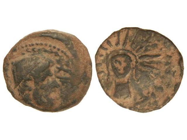 As. MALACA. Anv.: Cabeza de Vulcano con barba y birrete cónico a derecha, delante leyenda, detrás tenazas. Rev.: Busto de Helios de frente radiado. 10,20 grs. Pátina verde oscura. AB-1726; G.G.-1. MBC-.