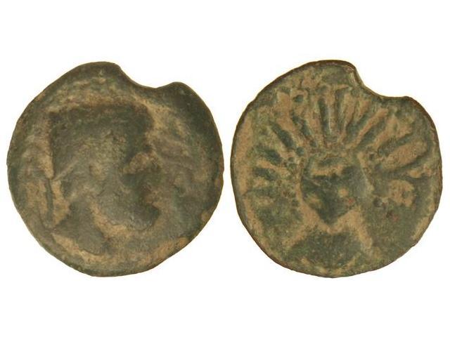 As. MALACA. Anv.: Cabeza de Vulcano con barba y birrete cónico a derecha, delante leyenda, detrás tenazas. Rev.: Busto de Helios de frente radiado. 7,90 grs. Pátina verde. (Cospel algo faltado). AB-1726; G.G.-1. BC+.