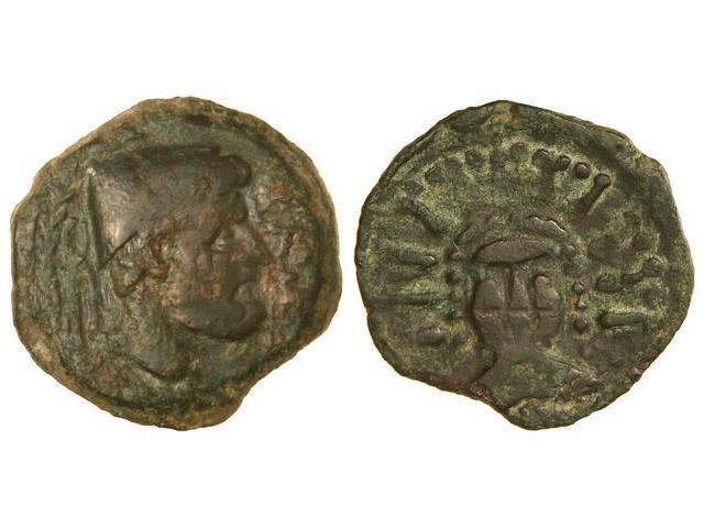 As. MALACA. Anv.: Cabeza de Vulcano con barba y birrete cónico a derecha, delante leyenda y detrás tenazas. Rev.: Busto de Helios de frente radiado. 10,10 grs. Pátina verde y rojiza. AB-1726; G.G.-1. (MBC+).