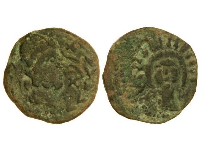 As. MALACA. Anv.: Cabeza de Vulcano con barba y birrete redondeado terminado en borla a derecha, delante leyenda, detrás tenazas. Rev.: Cabeza de Helios de frente, rodeada de rayos. 7,60 grs. Variante de reverso y arte tosco. Pátina verde. (