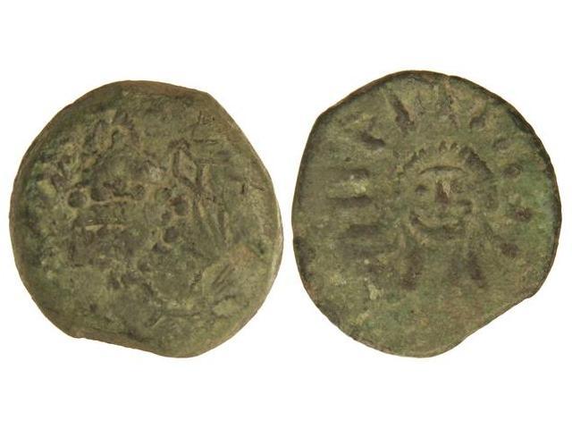 As. MALACA. Anv.: Cabeza de Vulcano con birrete cónico a izquierda, detrás tenazas y (leyenda). Rev.: Busto de Helios de frente, la cabeza rodeada de rayos. 13,20 grs. Pátina verde. AB-1730 var.; G.G.-28. MBC-.