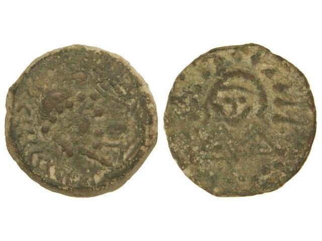 As. MALACA. Anv.: Cabeza de Vulcano con birrete cónico a izquierda, detrás tenazas y (leyenda). Rev.: Busto de Helios de frente, la cabeza rodeada de rayos. 10,20 grs. Pátina verde. AB-1730 var.; G.G.-28. MBC-.