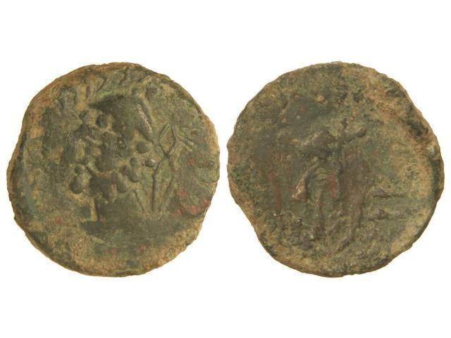 As. MALACA. Anv.: Cabeza de Vulcano con birrete cónico a izquierda detrás tenazas y (leyenda). Rev.: Busto de Helios de frente, la cabeza rodeada de rayos. 10,60 grs. Variante de G.G.-28 por doble línea de puntos para representar la barba. Pátina verde oscura. AB-1730 var.; G.G.-29. MBC-/BC+.