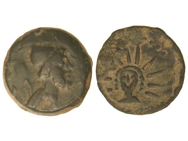 As. MALACA. Anv.: Cabeza de Vulcano con birrete cónico terminado en borla a derecha, delante (leyenda), detrás tenazas. Rev.: Cabeza de Helios de frente radiado. 11,40 grs. Variante por la terminación en corla del birrete. Pátina negra. (Oxidaciones en reverso). AB-1726 var.; G.G.-4. MBC.