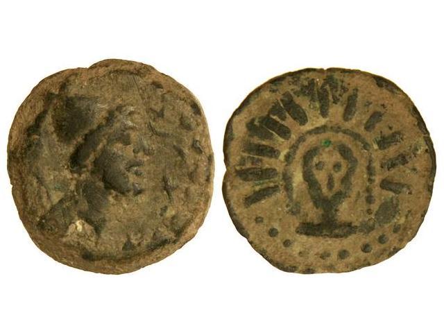 As. MALACA. Anv.: Cabeza de Vulcano con birrete cónico terminado en borla a derecha, delante leyenda, detrás tenazas. Rev.: Cabeza de Helios de frente radiado. 10,20 grs. Variante por la terminación en borla del birrete. Pátina verde oscura.