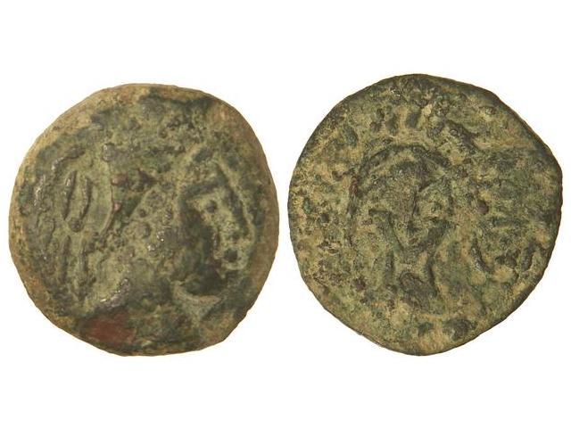 As. MALACA. Anv.: Cabeza de Vulcano con birrete cónico terminado en borla y coleta en la nuca a derecha, delante (leyenda), detrás tenazas. Rev.: Cabeza de Helios de frente rodeada de rayos. 9,30 grs. Variante por forma del gorro y láurea esquemática. Pátina verde. (Oxidaciones). AB-1726 var.; G.G.-7. MBC/MBC-.