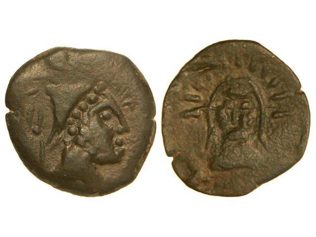 As. MALACA. Anv.: Cabeza de Vulcano con birrete cónico terminado en borlas y coleta en la nuca a derecha, delante leyenda, detrás tenazas. Rev.: Cabeza de Helios de frente rodeada de rayos. 9 grs. Variante por fomra del gorro y láurea esquem