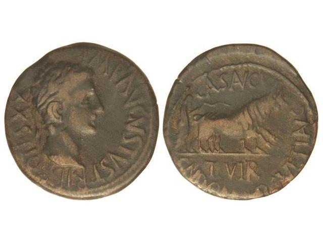 As. ÉPOCA DE AUGUSTO. CAESARAUGUSTA. Anv.: IMP. AVGVSTVS TRIB. (P)OTES XX. Cabeza laureada de Augusto a derecha. Rev.: CAES. AVG(VS.) CN. DO(M. AMP. C.) VET. LA NC. (I)I VIR. Yunta a derecha. 10,70 grs. Pátina oscura. AB-327. MBC-.