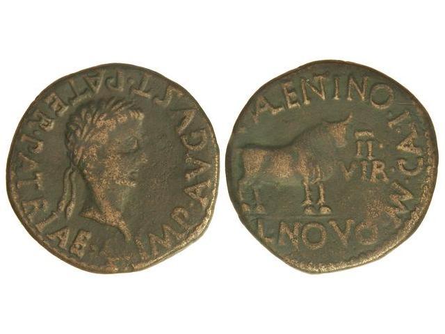 As. ÉPOCA DE AUGUSTO. CALAGURRIS. Anv.: IMP. AVGVST. PATER PATRIAE. Cabeza laureada de Augusto a derecha. Rev.: II VIR. L. VALENTINO L. NOVO M. CAL. I. Toro a derecha. 13,50 grs. Pátina oscura. AB-418. MBC.