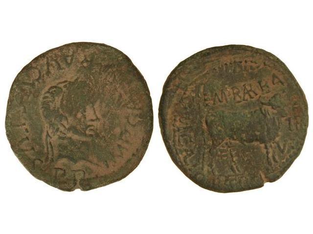 As. - ÉPOCA DE AUGUSTO. - CALAGURRIS. - Anv.: IMP. CAESAR AVGVSTVS P. P. Cabeza laureada de Augusto a derecha. Rev.: C. SEMP. CARBA. Q. BAEB. FLAVD. M. CAL. I II VIR. Toro a derecha. 11,20 grs. Pátina verde. (Leyenda poco visible. Repicada o doble acuñación). AB-422. BC+. - -