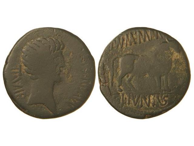 As. - ÉPOCA DE AUGUSTO. - CALAGURRIS. - Anv.: MVN. CAL. II VIR. Cabeza desnuda de Augusto a derecha. Rev.: MV. MEMMI. L. IVNI. Toro a derecha. 10,60 grs. Pátina negra. AB-405. BC/BC+. - -
