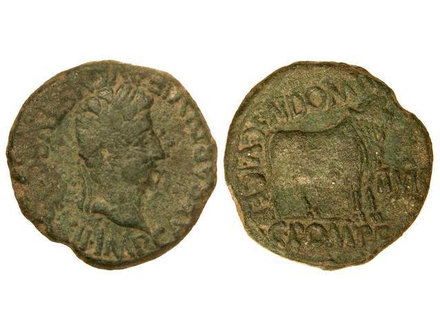 As. ÉPOCA DE AUGUSTO. CELSE. Anv.: Cabeza laureada de Augusto a derecha, alrededor IMP. CAESAR DIVI. F. AVGVSTVS COS. XII. Rev.: Toro a derecha. CN. DOMIT. C. POMPEI. II VIR. C. V. I. CEL. 12,30 grs. Pátina verde. AB- 811. MBC-/MBC.