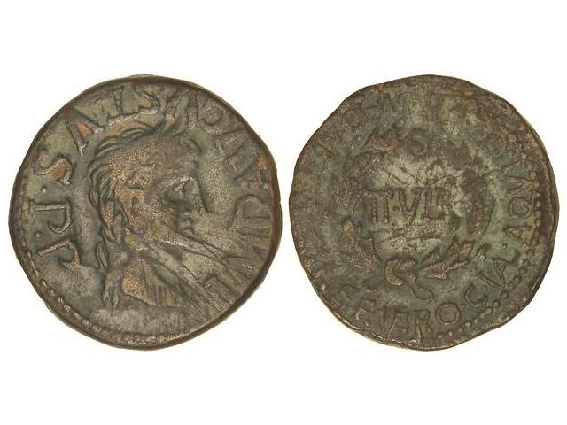 As. ÉPOCA DE AUGUSTO. TURIASO. Anv.: IMP. AVGVSTVS P. P. Cabeza laureada de Augusto a derecha. Rev.: II VIR. M. CAECIL. SEVERO C. VAL. AQVILO TVRIASO. Láurea. 10,18 grs. AB-2438. MBC.