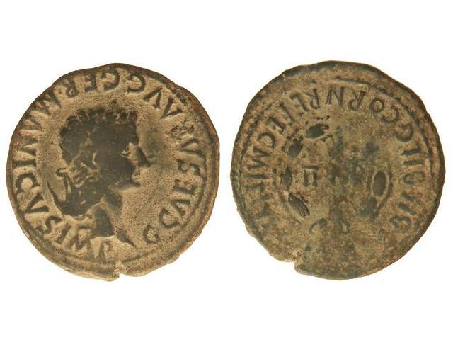 As. ÉPOCA DE CALÍGULA. BILBILIS. Anv.: Cabeza laureada a derecha. C. CAESAR AVG. GERMANICVS IMP. Rev.: Láurea dentro II VIR. alrededor (MVN. AVG.) BIBIL. C. CORN. REF. CM. (HELV. FRONT.). 11,706 grs. AB-287. MBC/MBC-.