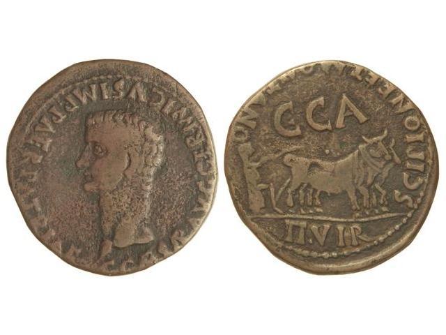 As. ÉPOCA DE CALÍGULA. CAESARAUGUSTA. Anv.: (C.) CAESAR AVG. GERMANICVS IMP. PATER PATRIAE. Cabeza de Calígula a izquierda. Rev.: C. C. A. SCIPIONE ET M(ONTA)NO. Yunta a derecha. 12 grs. AB-387. MBC-.