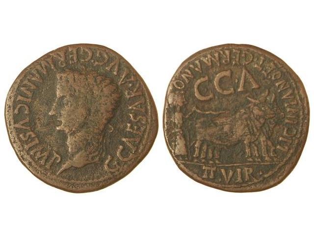 As. - ÉPOCA DE CALÍGULA. - CAESARAUGUSTA. - Anv.: G. CAESAR AVG. GERMANICVS IMP. Cabeza laureada de Calígula a izquierda. Rev.: C. C. A. LICINIANO ET GERMANO II VIR. Yunta a derecha. 10,90 grs. Pátina marrón. AB-391. MBC-. - -