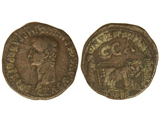 As. - ÉPOCA DE CALÍGULA. - CESARAUGUSTA. - Anv.: C. CAESAR AVG. GERMANICVS IMP. PATER PATRIAE. Cabeza de Calígula a izquierda. Rev.: TITVLLO ET MONTANO II VIR. P. C. C. A. Yunta a derecha. 13,80 grs. Pátina marrón. (Rayitas en anverso). AB-388. MBC-. - -