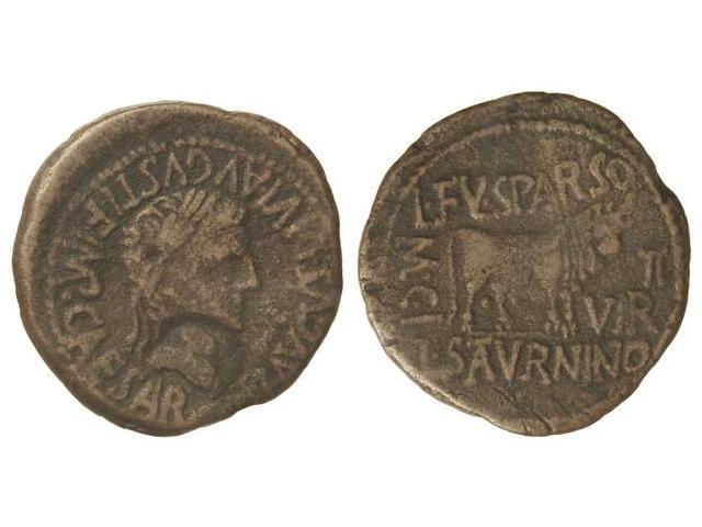 As. ÉPOCA DE TIBERIO. CALAGURRIS. Anv.: TI. AVGVS. DIVI. AVGVSTI F. IMP. CAESAR. Cabeza laureada de Tiberio a derecha. Resello de águila. Rev.: L. FVL. SPARSO. L. SATVRNINO II. VIR. M. C. I. Toro a derecha. 11,20 grs. AB-429. MBC-.