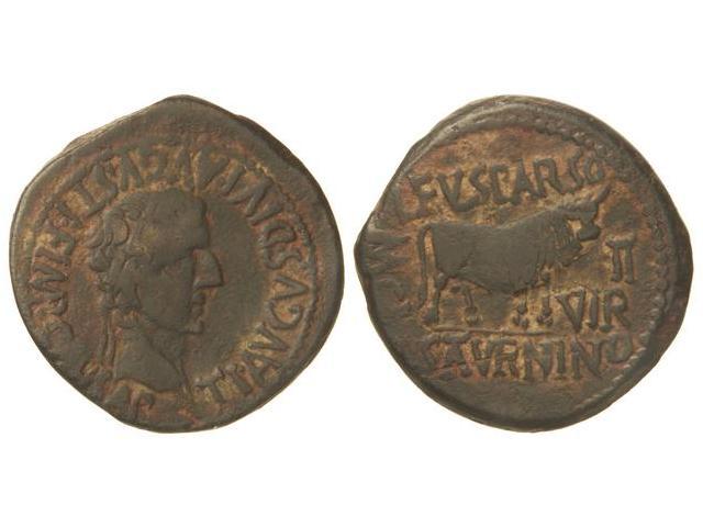 As. ÉPOCA DE TIBERIO. CALAGURRIS. Anv.: TI. AVGVS. DIVI. AVGVSTI. P. IMP. CAESAR. Cabeza laureada de Tiberio a derecha. Rev.: FCL. SPARSO. L.SATVRNINO II VIR. M. C. I. Toro a derecha. 13,10 grs. Pátina negra. AB-429. (MBC).