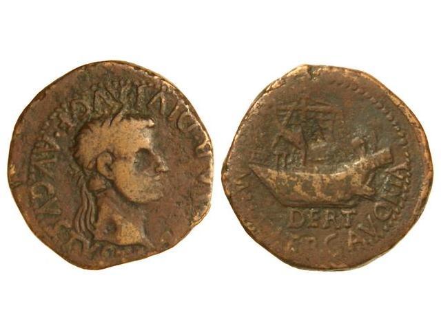 As. ÉPOCA DE TIBERIO. ILERCAVONIA. Anv.: TI. CAESAR DIVI. AVG. AVGVSTVS. Cabeza laureada de Tiberio a derecha. Rev.: DER. (M. H. I.) ILERCAVONIA. Nave. 7,60 grs. Resello en reverso. AB-1493. BC+/MBC-.