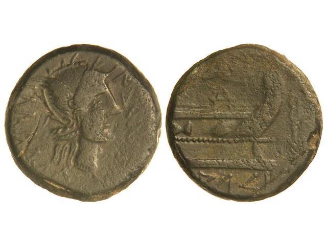 As. SAGUNTO. Anv.: Cabeza galeada de Roma a derecha, alrededor leyenda ibérica. Rev.: Proa a derecha, encima Victoria, a la derecha caduceo y debajo leyenda ibérica ARSE. 25,30 grs. Pátina oscura. AB-2076. MBC.