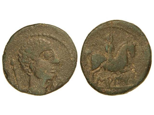 As. SAITI. Anv.: Cabeza masculina a derecha, detrás cetro, delante E Ba. Rev.: Jinete a derecha. SAITi. 13 grs. Pátina oscura. (Raya en reverso). RARA. AB-2099. MBC-.