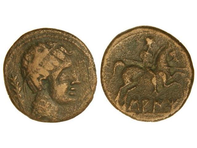As. SAITI. Anv.: Cabeza masculina con diadema a derecha, detrás espiga. Rev.: Jinete con lanza a derecha, debajo leyenda ibérica. 10,70 grs. AB-2100. MBC.