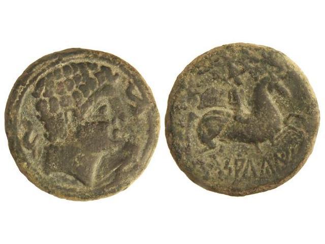 As. SALDUIE. Anv.: Cabeza masculina a derecha, rodeada de tres delfines. Rev.: Jinete con palma y clámide a derecha, debajo leyenda ibérica. 14,66 grs. Pátina verde. (Pequeñas oxidaciones en reverso). AB-305. MBC+/MBC.