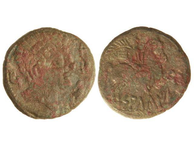 As. SALDUIE. Anv.: Cabeza masculina a derecha, rodeada de tres delfines. Rev.: Jinete con palma y clámide a derecha, debajo leyenda ibérica. 13,10 grs. Pátina marrón verdosa. AB-305. MBC-.