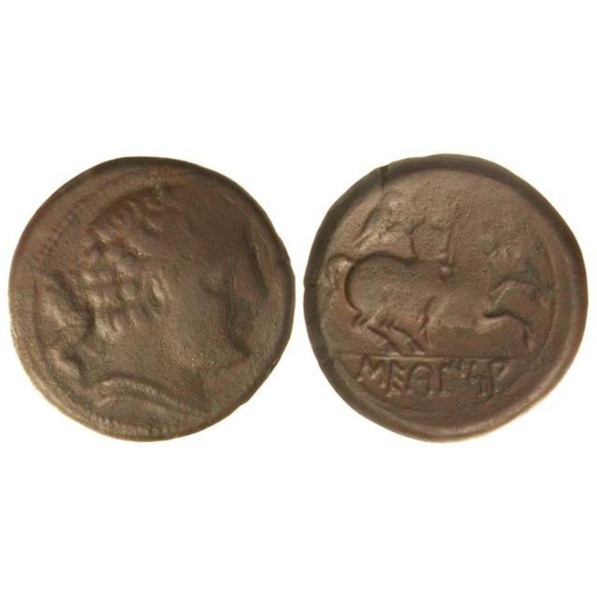 CELTIBERIAN COINS - As. - SECAISA. - Anv.: Cabeza masculina a derecha, detrás marca leona. Rev.: Jinete con insignia con águila debajo leyenda ibérica bajo línea. 18,60 grs. ESCASA. AB-2124. MBC. - -