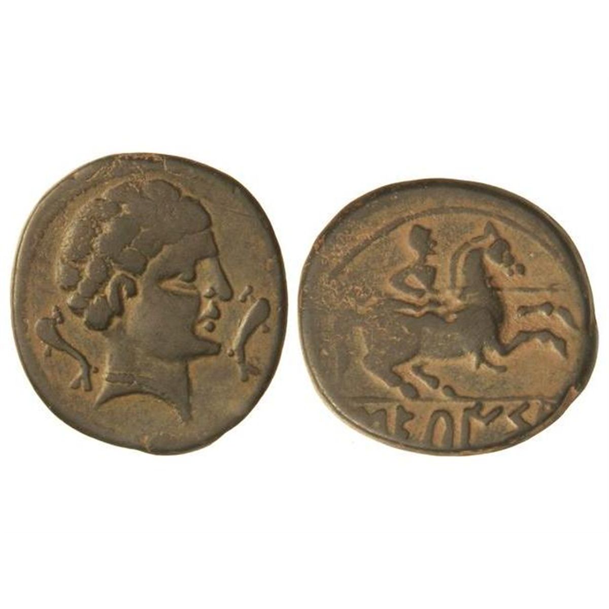 CELTIBERIAN COINS - As. - SECAISA. - Anv.: Cabeza masculina a derecha, entre delfines. Rev.: Jinete con lanza, debajo leyenda ibérica. 7,75 grs. Pátina oscura. AB-2131. MBC. - -