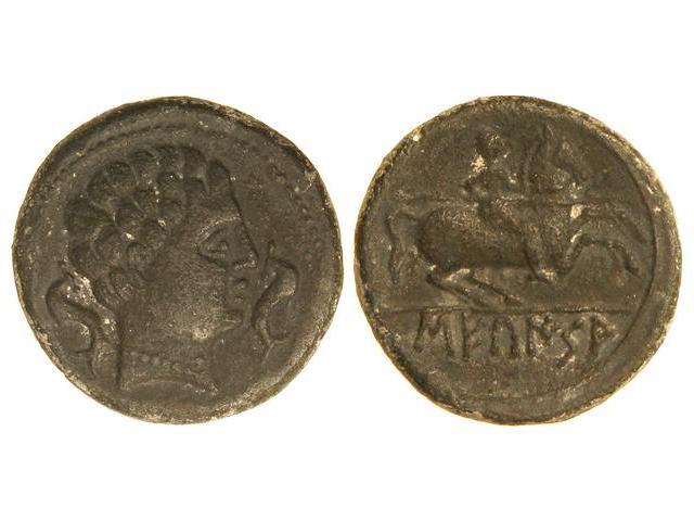 As. SECAISA. Anv.: Cabeza masculina a derecha, entre dos delfines. Rev.: Jinete a derecha. SECaISA. 8,60 grs. Pátina oscura. AB-2131. MBC+.