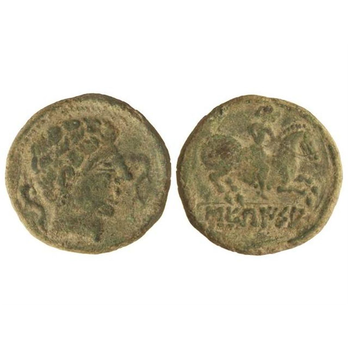 As. - SECAISA. - Anv.: Cabeza masculina a derecha entre dos delfines. Rev.: Jinete con lanza a derecha, debajo leyenda ibérica. 10,70 grs. Pátina verde. AB-2131. (MBC+). - -