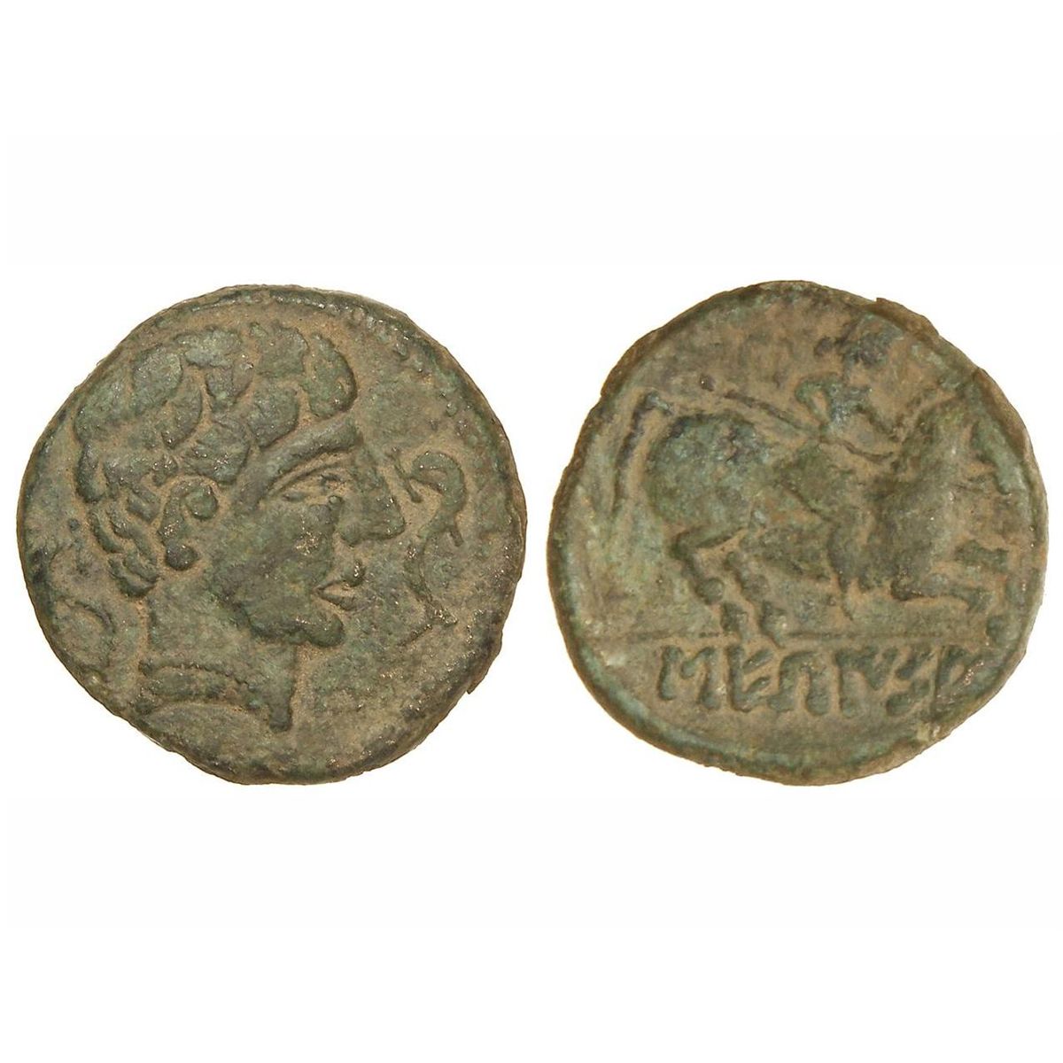 As. - SECAISA. - Anv.: Cabeza masculina a derecha entre dos delfines. Rev.: Jinete con lanza a derecha, debajo de linea leyenda ibérica. AB-2131. MBC+/MBC. - -